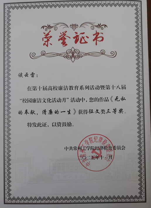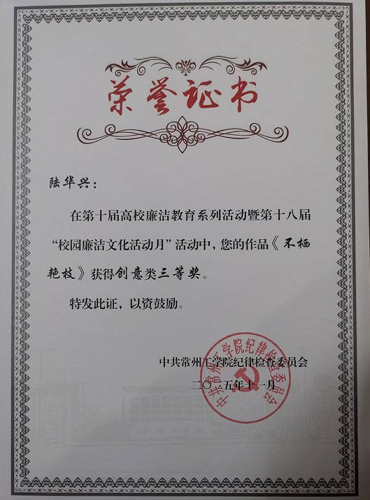 根据学校纪委《关于公布第十届高校廉洁教育系列活动暨第十八届“校园廉洁文化活动月”活动获奖名单的通知》(常工纪〔2025〕7号),离退休党委党员周兴林的漫画作品《大吃一惊》获一等奖、谈云雷的征文《无私的奉献、清廉的一生》和陆华兴的书画作品《不栖艳枝》分获三等奖。