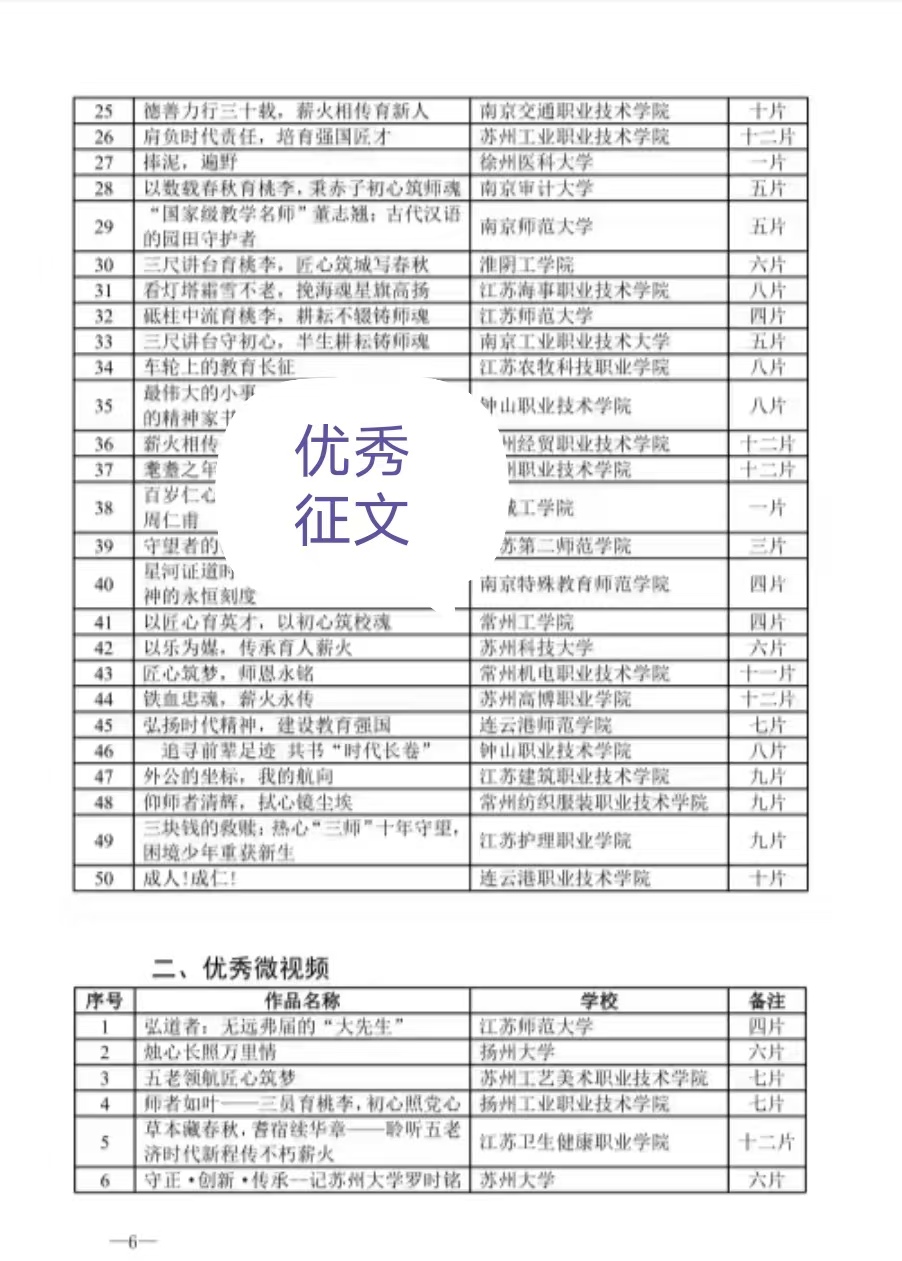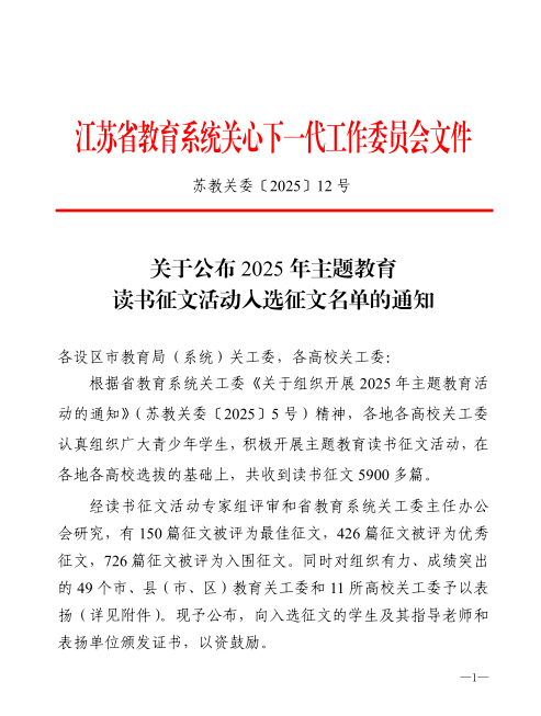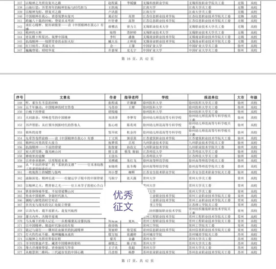 近日,江苏省教育系统关工委发布《关于公布2025年主题教育读书征文活动入选征文名单的通知》(苏教关委〔2025〕12号)和《关于公布2025年“读懂中国”活动入选作品名单的通知(苏教关委〔2025〕13号),我校4名学生的作品获奖在列。其中,汽车工程学院23汽车一班薛诗旸的《以中国精神,锻造时代驱动的车轮》获主题教育读书征文活动优秀征文奖,汽车工程学院23汽车二班李俊杰的《中国精神照亮青年前行之路》、电气信息工程学院24电二班蒋秀珠的《脊梁上的星河》(指导老师:杨鸿飞)、人文学院24汉二班邱旭慧的《脊梁挺立处 中华梦圆时》分别获主题教育读书征文活动入围征文奖。师范学院22小教二班潘钰婷的《以匠心育英才 以初心筑校魂》(指导老师:王爱祥)获 “读懂中国”活动优秀征文奖。